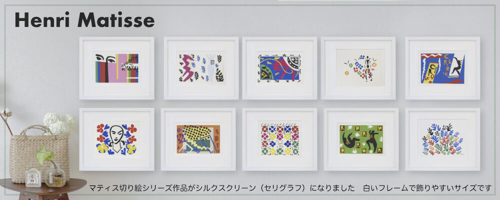 アンリ・マティス(マチス)切り絵作品がシルクスクリーン(セリグラフ)になりました。白いフレームで飾りやすいサイズ、並べて飾っても素敵です!全10種類
